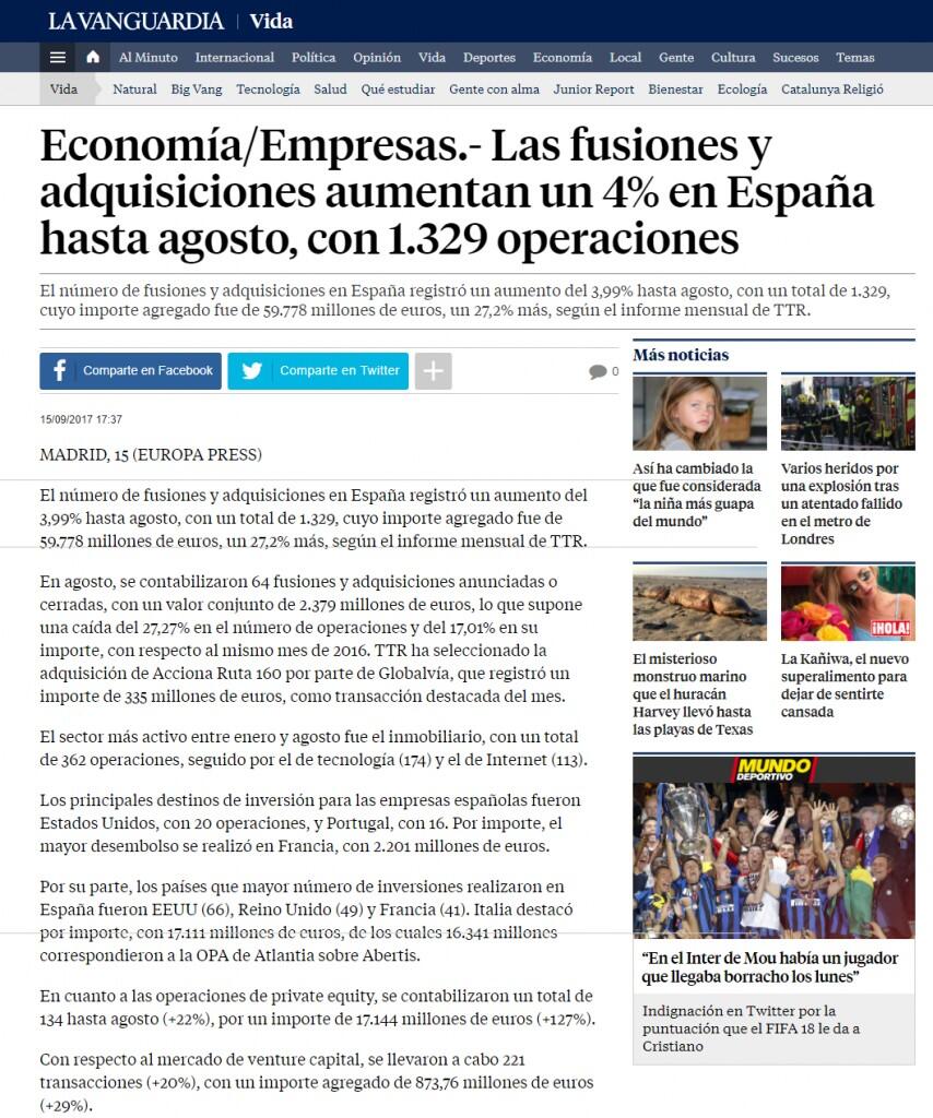 En agosto, se contabilizaron 64 fusiones y adquisiciones anunciadas o cerradas, con un valor conjunto de 2.379 millones de euros, lo que supone una caída del 27,27% en el número de operaciones y del 17,01% en su importe, con respecto al mismo mes de 2016. TTR ha seleccionado la adquisición de Acciona Ruta 160 por parte de Globalvía, que registró un importe de 335 millones de euros, como transacción destacada del mes.
