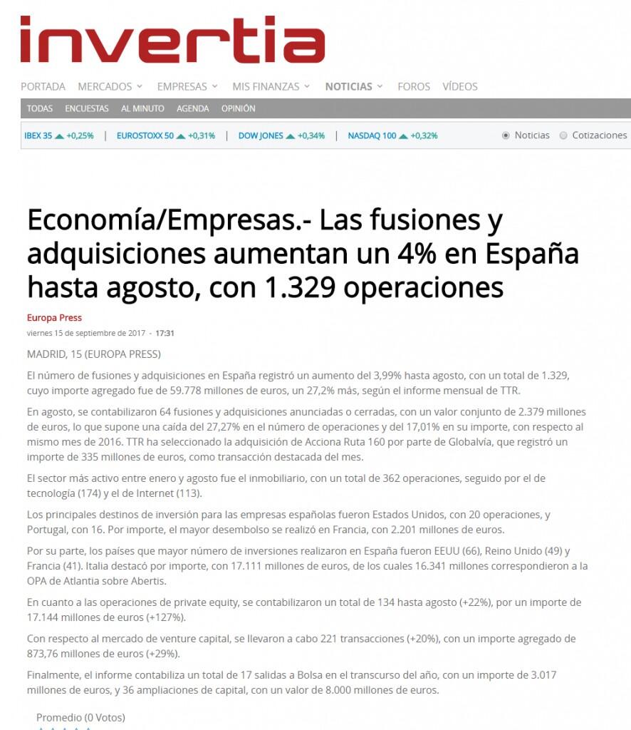 En agosto, se contabilizaron 64 fusiones y adquisiciones anunciadas o cerradas, con un valor conjunto de 2.379 millones de euros, lo que supone una caída del 27,27% en el número de operaciones y del 17,01% en su importe, con respecto al mismo mes de 2016. TTR ha seleccionado la adquisición de Acciona Ruta 160 por parte de Globalvía, que registró un importe de 335 millones de euros, como transacción destacada del mes.
