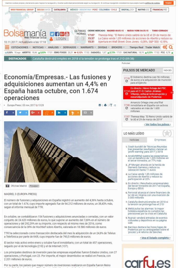 El número de fusiones y adquisiciones en España registró un aumento del 4,36% hasta octubre, con un total de 1.674, cuyo importe agregado fue de 94.212 millones de euros, un 38,43% más, según el informe mensual de TTR.