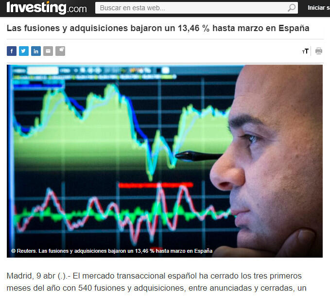 Las fusiones y adquisiciones bajaron un 13,46 % hasta marzo en Espaņa