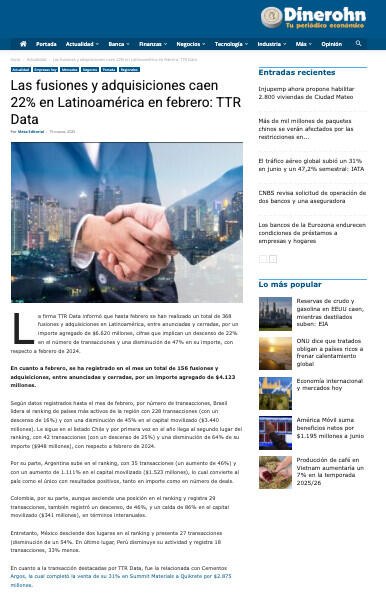 La firma TTR Data informó que hasta febrero se han realizado un total de 361 fusiones y adquisiciones en Latinoamérica, entre anunciadas y cerradas, con un importe agregado de USD 14.213 millones. Esta cifra representa una disminución del -22% en el número de transacciones y una disminución del -57% en su importe, con respecto al mismo período de 2024.
