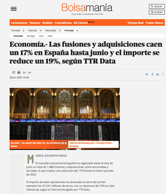 Las fusiones y adquisiciones caen un 17% en España hasta junio y el importe se reduce un 19%, según TTR Data