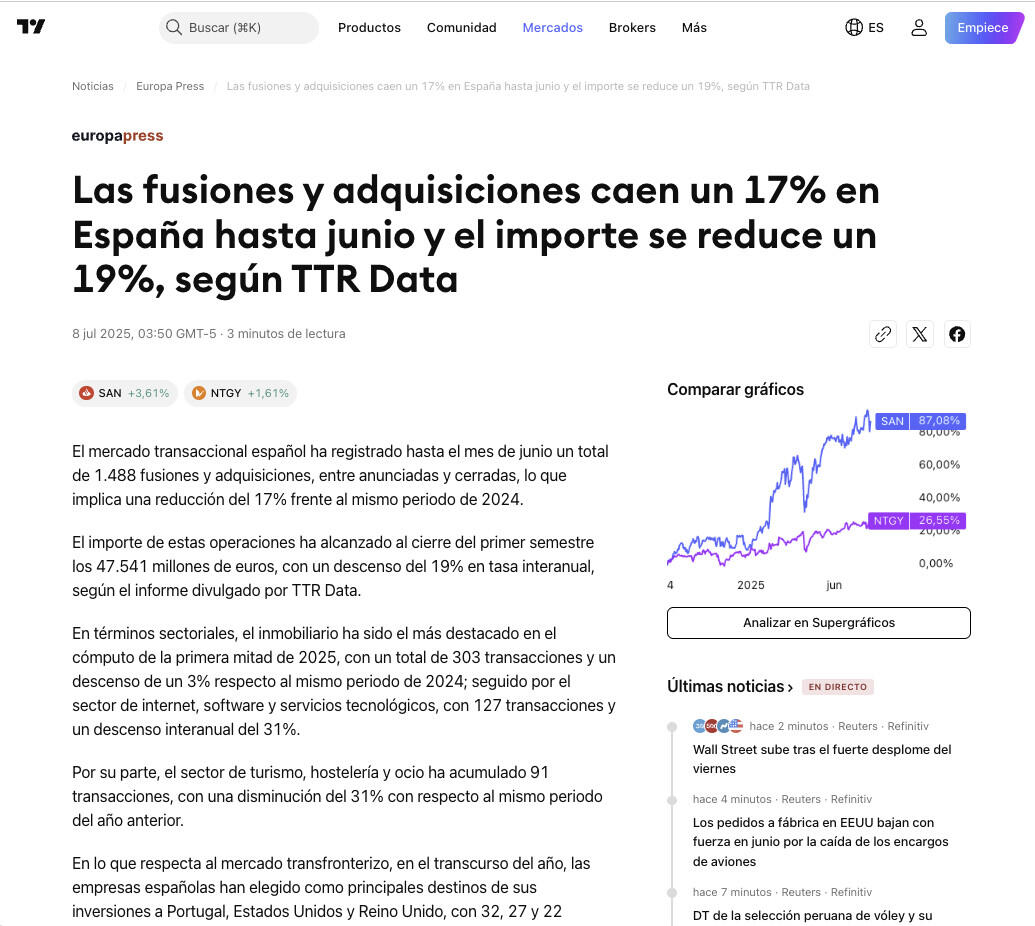 Las fusiones y adquisiciones caen un 17% en España hasta junio y el importe se reduce un 19%, según TTR Data