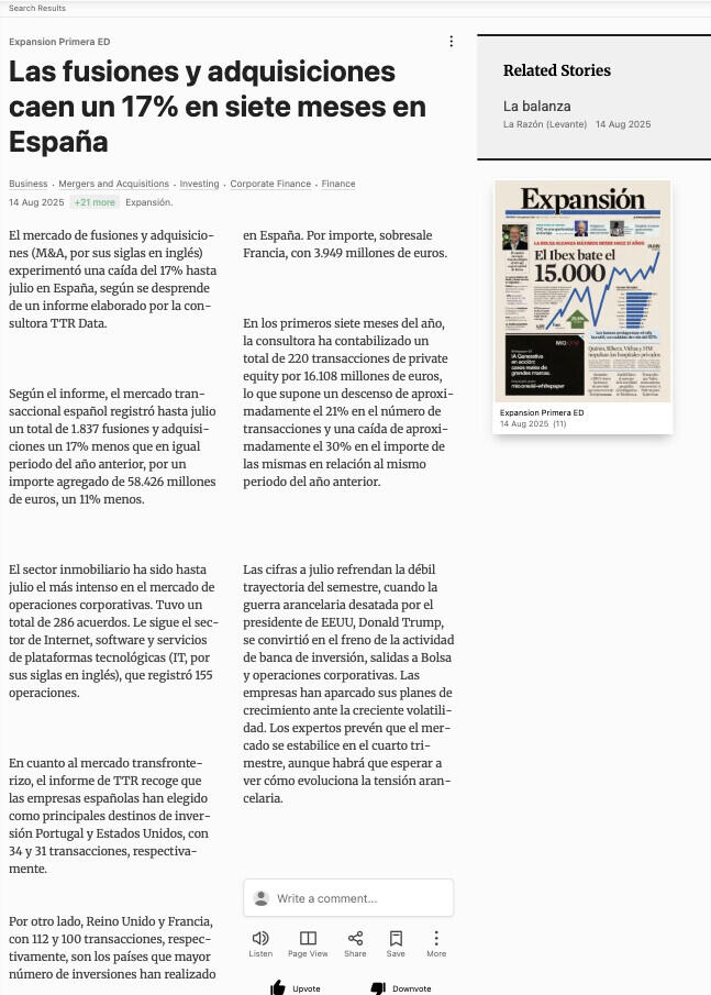 El mercado de fusiones y adquisiciones (M&A, por sus siglas en inglés) experimentó una caída del 17% hasta julio en España, según se desprende de un informe elaborado por la consultora TTR Data.