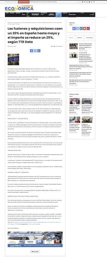 The post Las fusiones y adquisiciones caen un 20% en España hasta mayo y el importe se reduce un 25%, según TTR Data first appeared on Crónica de Cantabria.