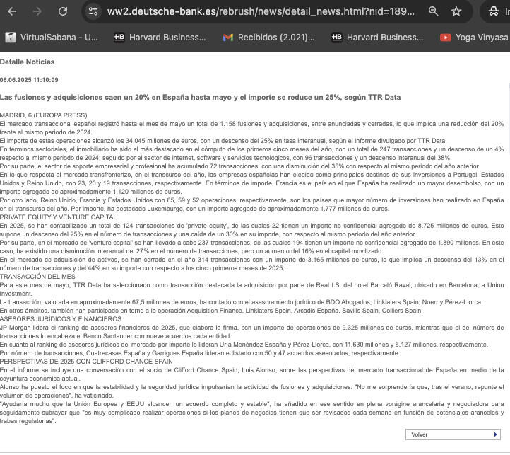 El mercado transaccional español registró hasta el mes de mayo un total de 1.158 fusiones y adquisiciones, entre anunciadas y cerradas, lo que implica una reducción del 20% frente al mismo periodo de 2024.
