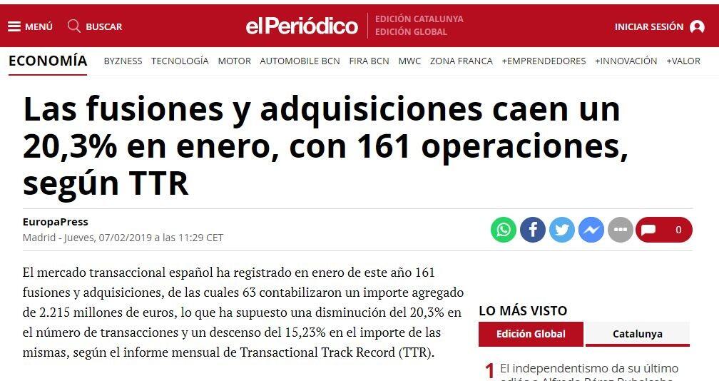 El mercado transaccional español ha registrado en enero de este año 161 fusiones y adquisiciones, de las cuales 63 contabilizaron un importe agregado de 2.215 millones de euros, lo que ha supuesto una disminución del 20,3% en el número de transacciones y un descenso del 15,23% en el importe de las mismas, según el informe mensual de Transactional Track Record (TTR).