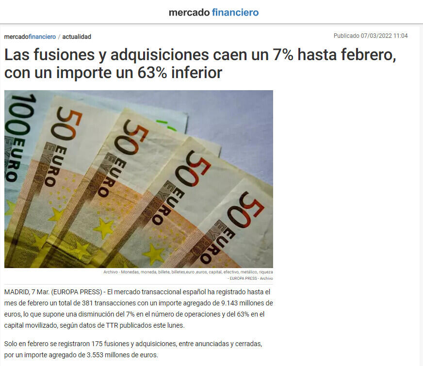 Solo en febrero se registraron 175 fusiones y adquisiciones, entre anunciadas y cerradas, por un importe agregado de 3.553 millones de euros.
