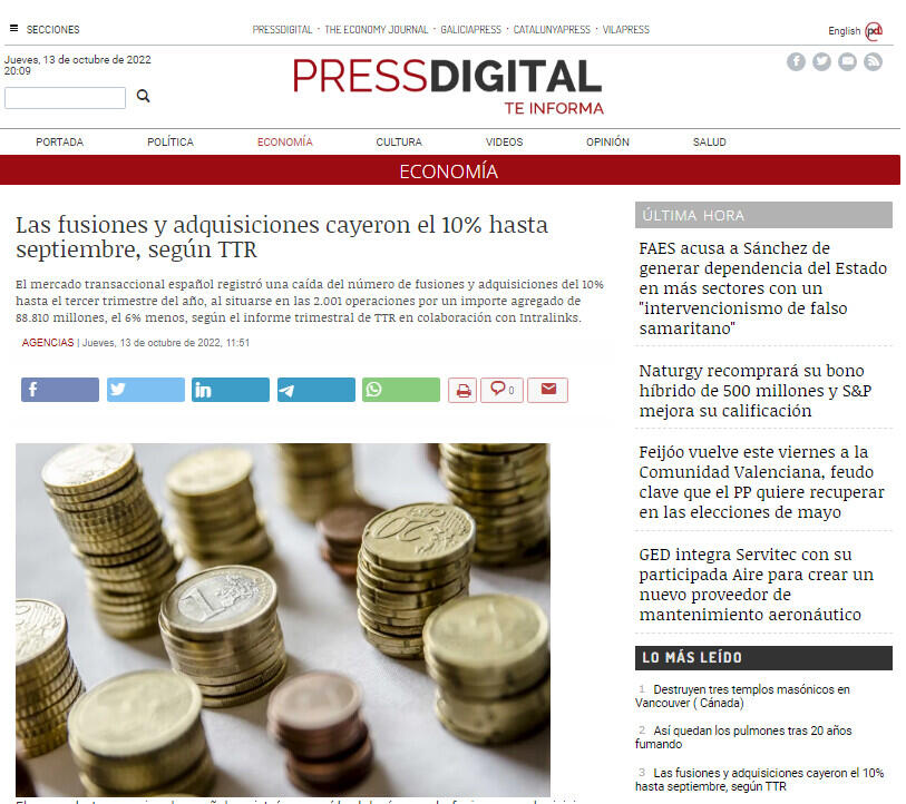 El mercado transaccional español registró una caída del número de fusiones y adquisiciones del 10% hasta el tercer trimestre del año, al situarse en las 2.001 operaciones por un importe agregado de 88.810 millones, el 6% menos, según el informe trimestral de TTR en colaboración con Intralinks.