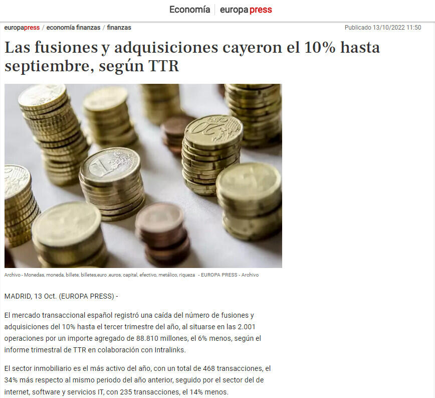 Las fusiones y adquisiciones cayeron el 10% hasta septiembre, según TTR