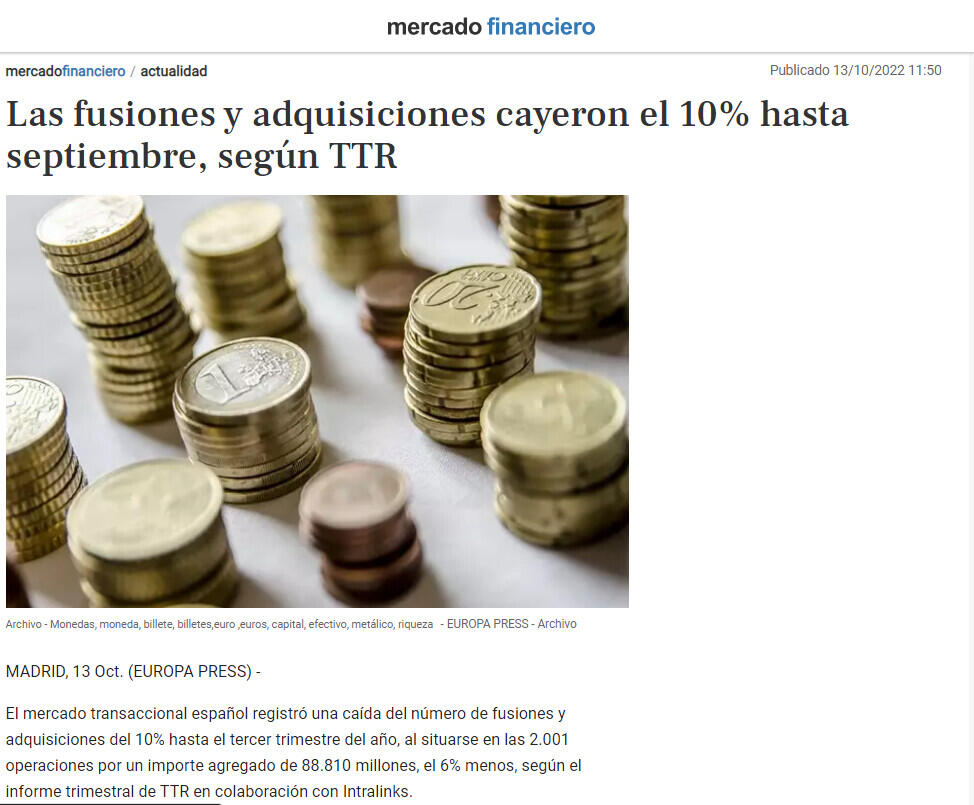 Las fusiones y adquisiciones cayeron el 10% hasta septiembre, según TTR