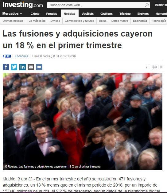 En el primer trimestre del año se registraron 471 fusiones y adquisiciones, un 18 % menos que en el mismo periodo de 2018, por un importe de 15.046 millones de euros, el 9,2 % de descenso, según datos de la plataforma digital TTR.