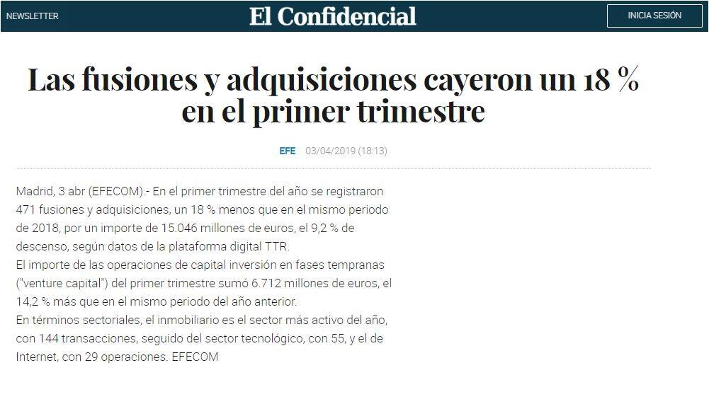 En el primer trimestre del año se registraron 471 fusiones y adquisiciones, un 18 % menos que en el mismo periodo de 2018, por un importe de 15.046 millones de euros, el 9,2 % de descenso, según datos de la plataforma digital TTR.