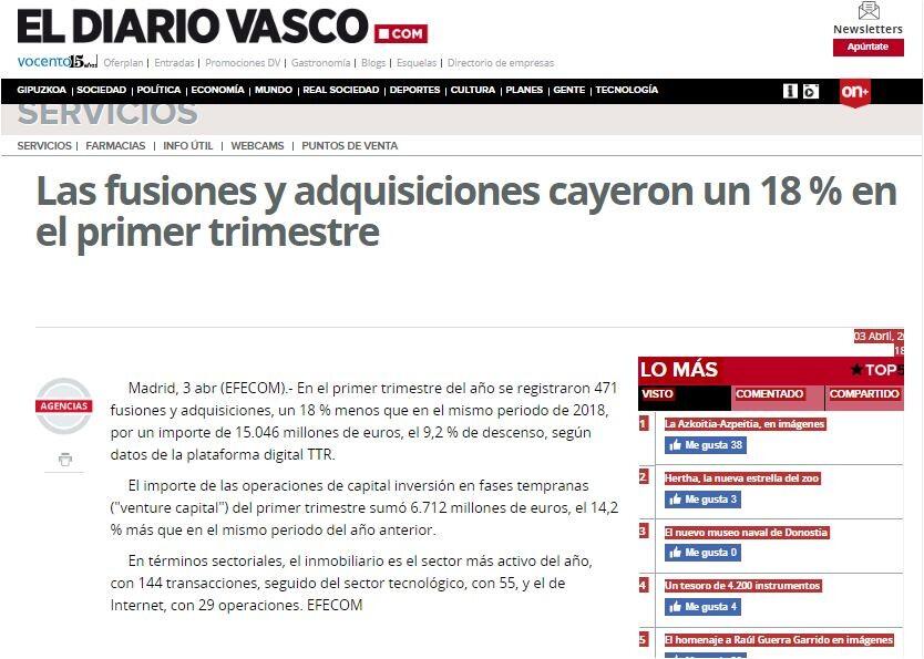 En el primer trimestre del año se registraron 471 fusiones y adquisiciones, un 18 % menos que en el mismo periodo de 2018, por un importe de 15.046 millones de euros, el 9,2 % de descenso, según datos de la plataforma digital TTR.
