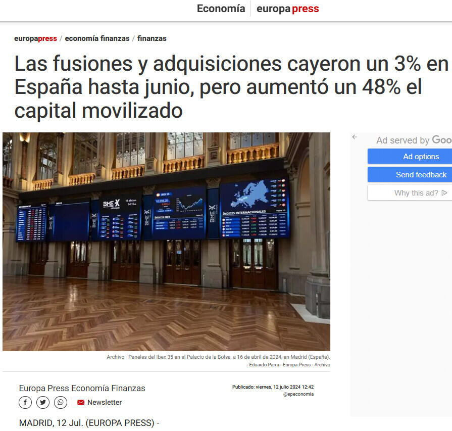 Las fusiones y adquisiciones cayeron un 3% en España hasta junio, pero aumentó un 48% el capital movilizado
