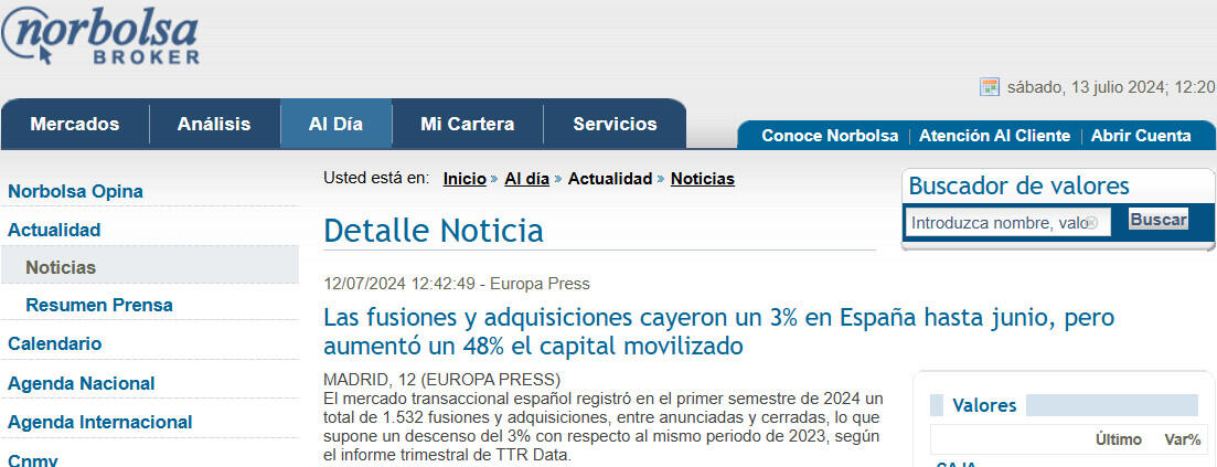 El mercado transaccional español registró en el primer semestre de 2024 un total de 1.532 fusiones y adquisiciones, entre anunciadas y cerradas, lo que supone un descenso del 3% con respecto al mismo periodo de 2023, según el informe trimestral de TTR Data.
