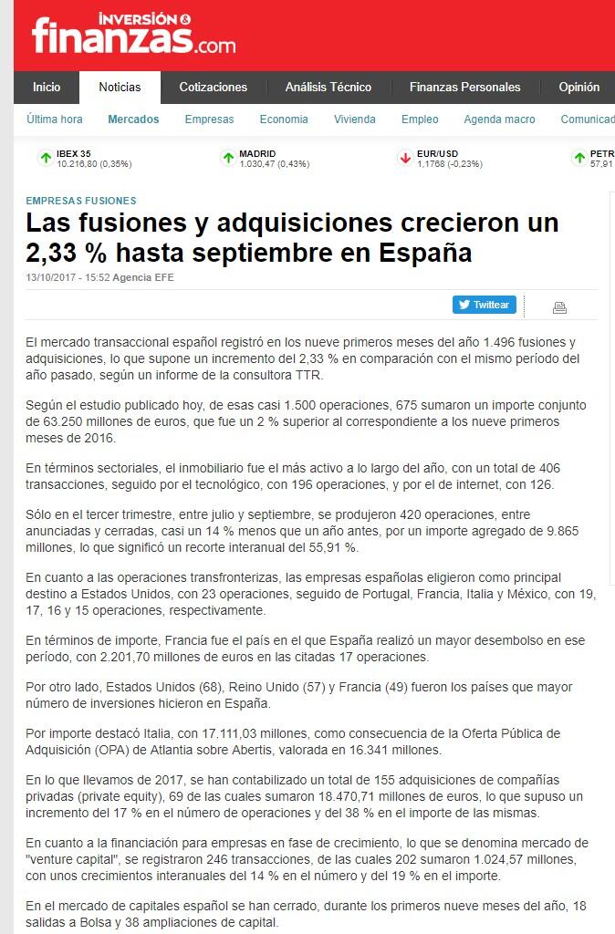 En lo que llevamos de 2017, se han contabilizado un total de 155 adquisiciones de compañías privadas (private equity), 69 de las cuales sumaron 18.470,71 millones de euros, lo que supuso un incremento del 17 % en el número de operaciones y del 38 % en el importe de las mismas.