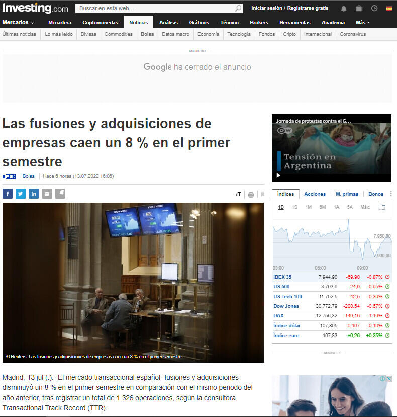 El mercado transaccional español -fusiones y adquisiciones- disminuyó un 8 % en el primer semestre en comparación con el mismo periodo del año anterior, tras registrar un total de 1.326 operaciones, según la consultora Transactional Track Record (TTR).