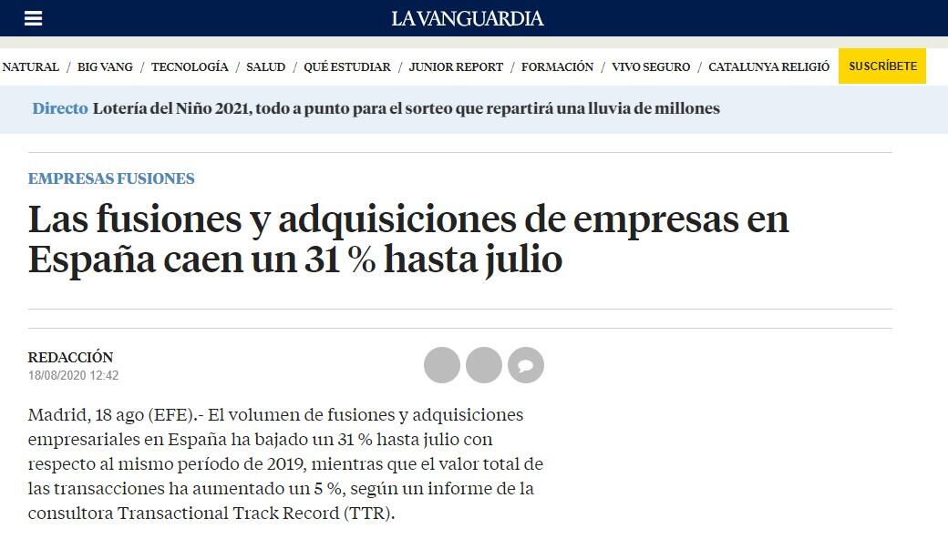 El volumen de fusiones y adquisiciones empresariales en España ha bajado un 31 % hasta julio con respecto al mismo período de 2019, mientras que el valor total de las transacciones ha aumentado un 5 %, según un informe de la consultora Transactional Track Record (TTR).