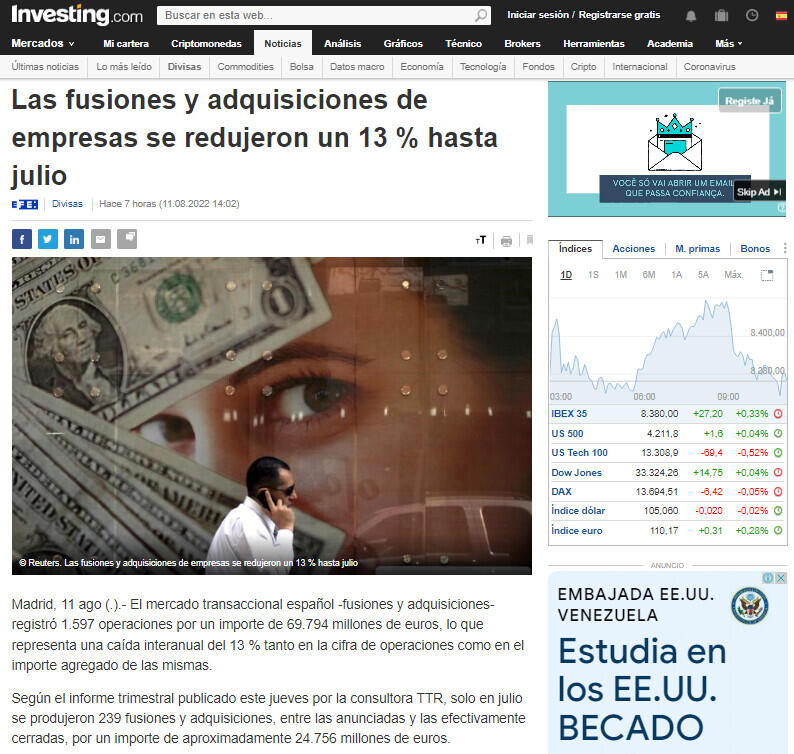 Las fusiones y adquisiciones de empresas se redujeron un 13 % hasta julio