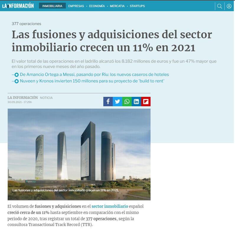 El volumen de fusiones y adquisiciones en el sector inmobiliario español creció cerca de un 11% hasta septiembre en comparación con el mismo periodo de 2020, tras registrar un total de 377 operaciones, según la consultora Transactional Track Record (TTR).