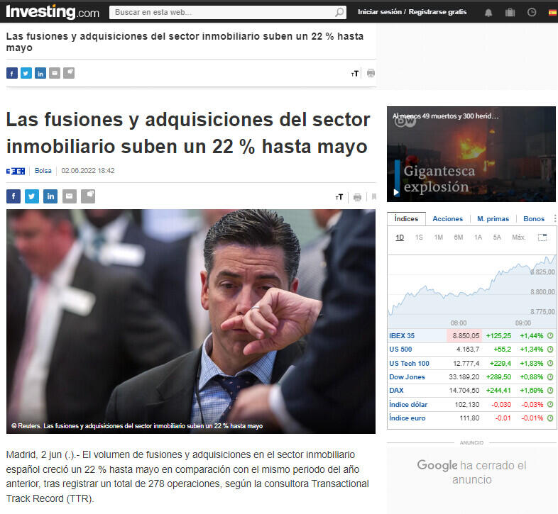 Las fusiones y adquisiciones del sector inmobiliario suben un 22 % hasta mayo