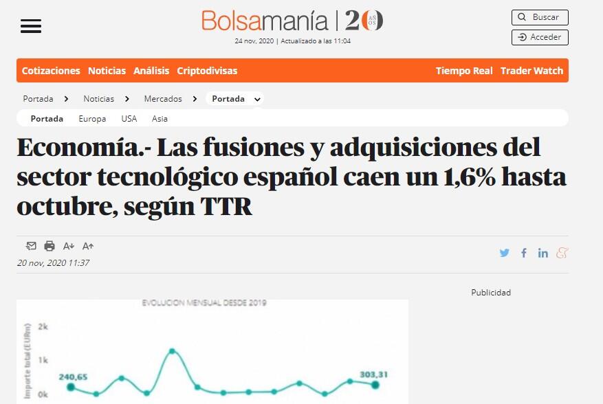 Las fusiones y adquisiciones del sector tecnológico español caen un 1,6% hasta octubre, según TTR