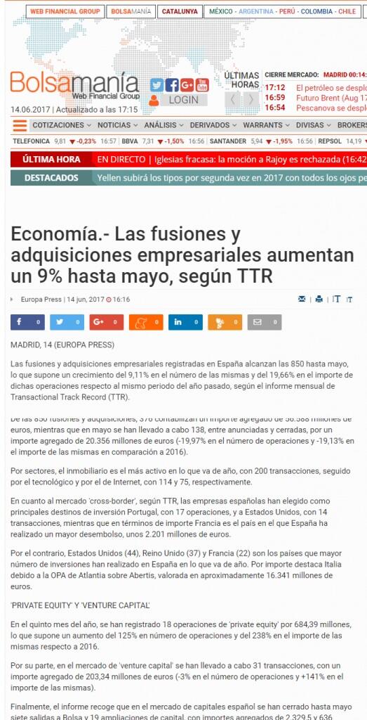 Las fusiones y adquisiciones empresariales registradas en España alcanzan las 850 hasta mayo, lo que supone un crecimiento del 9,11% en el número de las mismas y del 19,66% en el importe de dichas operaciones respecto al mismo periodo del año pasado, según el informe mensual de Transactional Track Record (TTR).