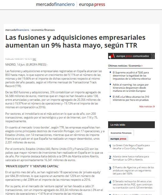 Las fusiones y adquisiciones empresariales registradas en España alcanzan las 850 hasta mayo, lo que supone un crecimiento del 9,11% en el número de las mismas y del 19,66% en el importe de dichas operaciones respecto al mismo periodo del año pasado, según el informe mensual de Transactional Track Record (TTR).