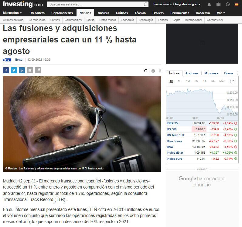 Solo en agosto, se registraron 100 fusiones y adquisiciones, 48 menos que en el mismo mes del año anterior, pese a que el volumen invertido creció cerca de un 19 % hasta situarse en 4.043 millones.