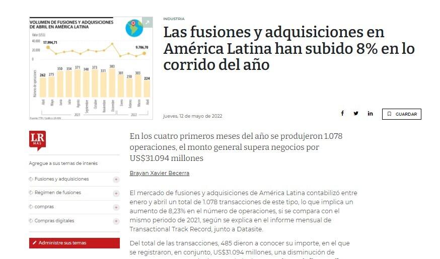El mercado de fusiones y adquisiciones de América Latina contabilizó entre enero y abril un total de 1.078 transacciones de este tipo, lo que implica un aumento de 8,23% en el número de operaciones, si se compara con el mismo periodo de 2021, según se explica en el informe mensual de Transactional Track Record, junto a Datasite.