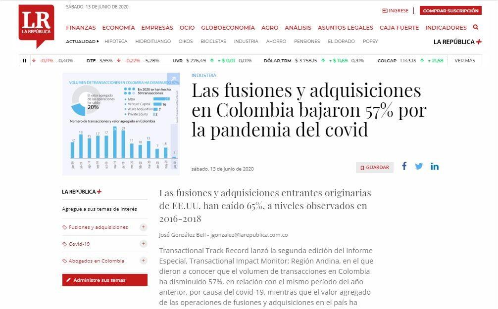 Transactional Track Record lanzó la segunda edición del Informe Especial, Transactional Impact Monitor: Región Andina, en el que dieron a conocer que el volumen de transacciones en Colombia ha disminuido 57%, en relación con el mismo período del año anterior, por causa del covid-19, mientras que el valor agregado de las operaciones de fusiones y adquisiciones en el país ha caído una quinta parte.