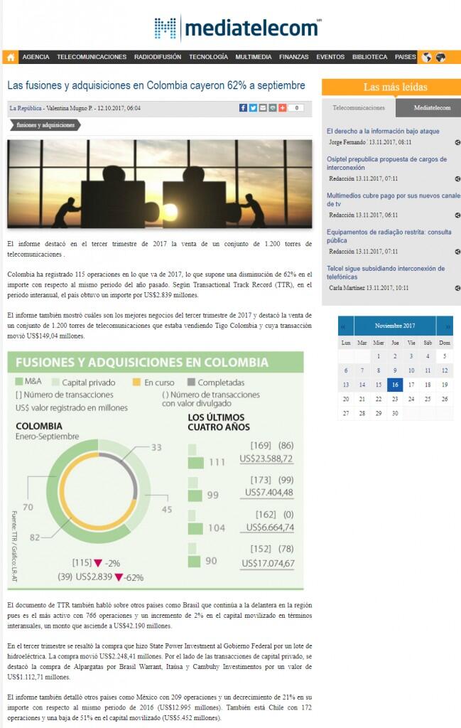 El informe también mostró cuáles son los mejores negocios del tercer trimestre de 2017 y destacó la venta de un conjunto de 1.200 torres de telecomunicaciones que estaba vendiendo Tigo Colombia y cuya transacción movió US$149,04 millones.