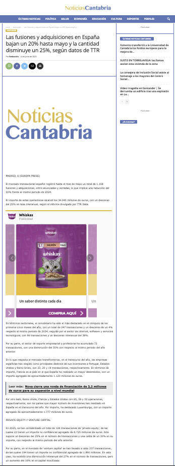 El mercado transaccional español registró hasta el mes de mayo un total de 1.158 fusiones y adquisiciones, entre anunciadas y cerradas, lo que implica una reducción del 20% frente al mismo periodo de 2024.