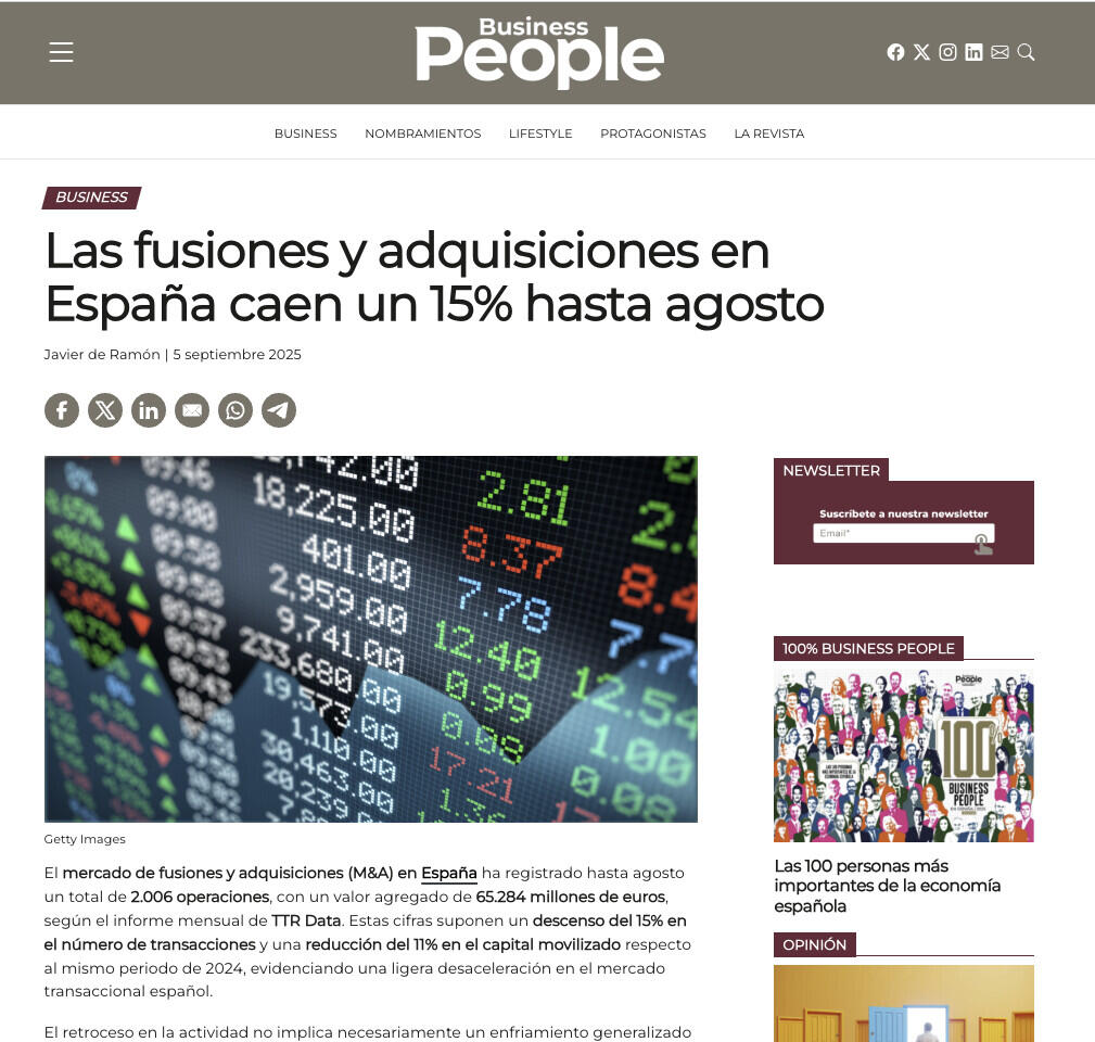 El mercado de fusiones y adquisiciones (M&A) en España ha registrado hasta agosto un total de 2.006 operaciones, con un valor agregado de 65.284 millones de euros, según el informe mensual de TTR Data. Estas cifras suponen un descenso del 15% en el número de transacciones y una reducción del 11% en el capital movilizado respecto al mismo periodo de 2024, evidenciando una ligera desaceleración en el mercado transaccional español.