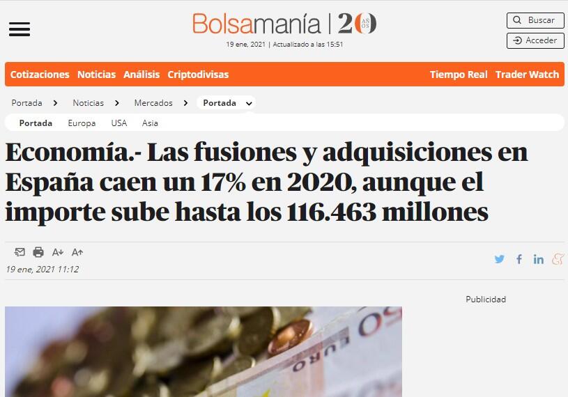 Las fusiones y adquisiciones en Espaņa caen un 17% en 2020, aunque el importe sube hasta los 116.463 millones