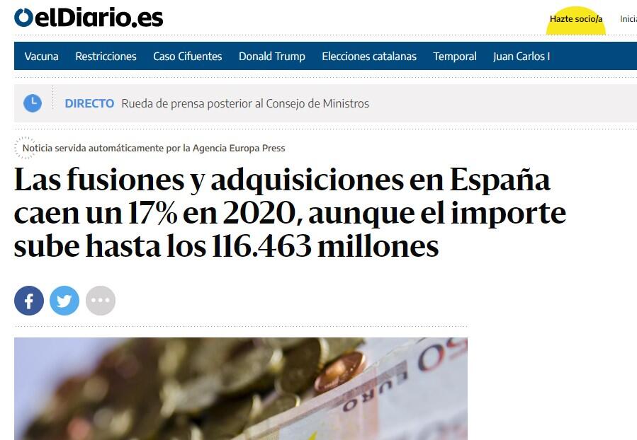 Las fusiones y adquisiciones en Espaņa caen un 17% en 2020, aunque el importe sube hasta los 116.463 millones