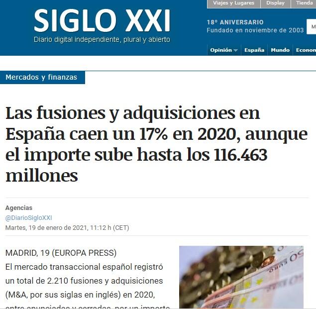 Las fusiones y adquisiciones en Espaņa caen un 17% en 2020, aunque el importe sube hasta los 116.463 millones