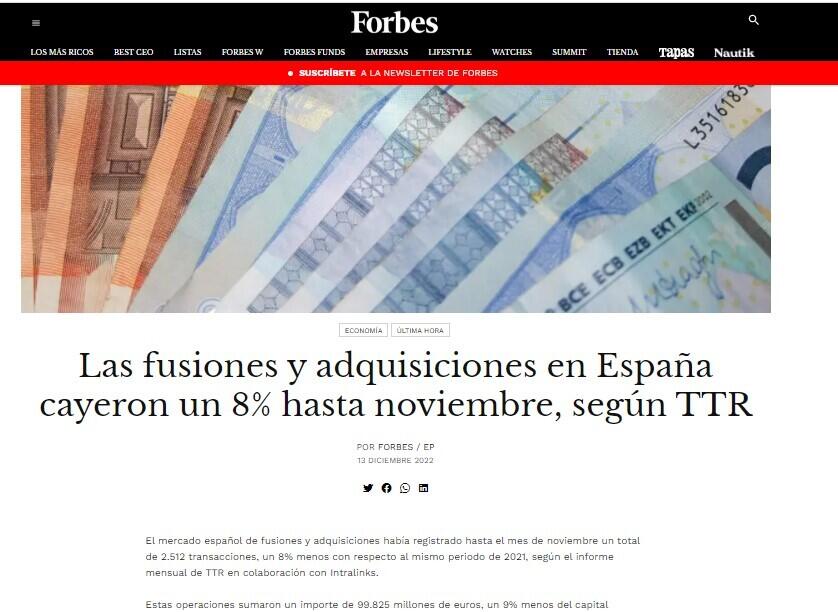 El mercado español de fusiones y adquisiciones había registrado hasta el mes de noviembre un total de 2.512 transacciones, un 8% menos con respecto al mismo periodo de 2021, según el informe mensual de TTR en colaboración con Intralinks.