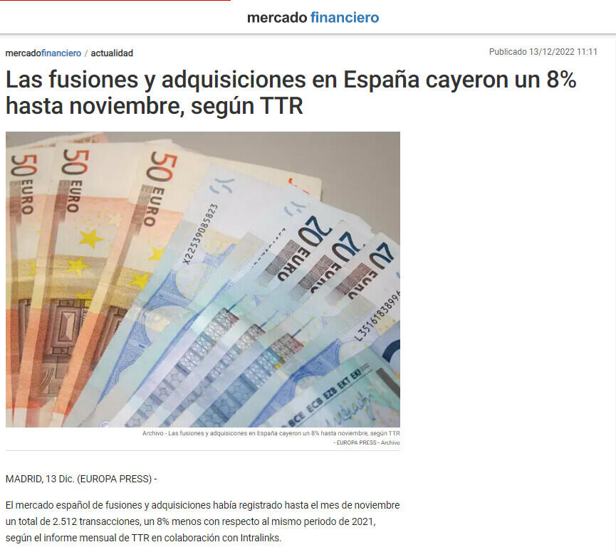 El mercado español de fusiones y adquisiciones había registrado hasta el mes de noviembre un total de 2.512 transacciones, un 8% menos con respecto al mismo periodo de 2021, según el informe mensual de TTR en colaboración con Intralinks.