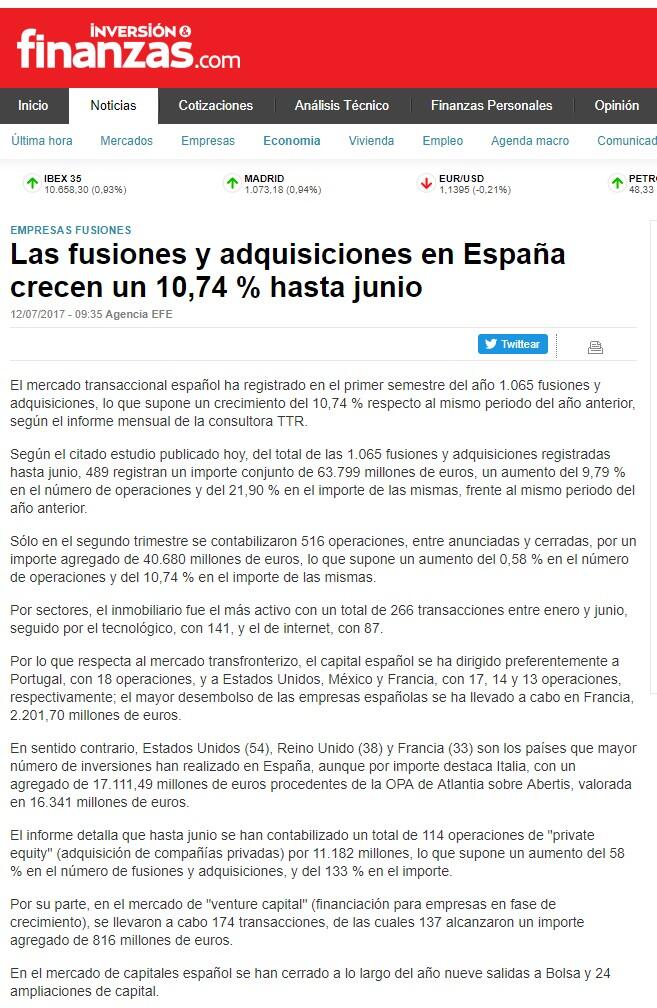 El mercado transaccional español ha registrado en el primer semestre del año 1.065 fusiones y adquisiciones, lo que supone un crecimiento del 10,74 % respecto al mismo periodo del año anterior, según el informe mensual de la consultora TTR.