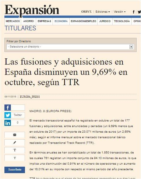 Las fusiones y adquisiciones en España disminuyen un 9,69% en octubre, según TTR