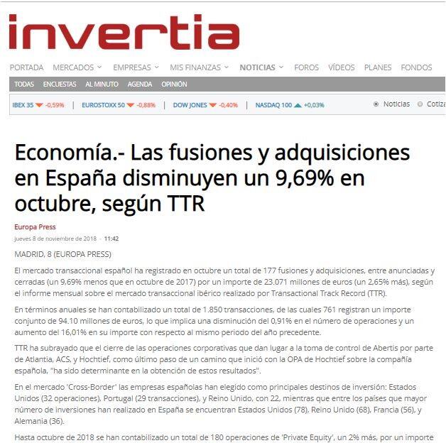Las fusiones y adquisiciones en España disminuyen un 9,69% en octubre, según TTR