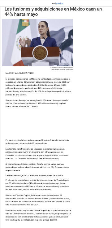 El mercado transaccional en México ha contabilizado, entre anunciadas y cerradas, un total de 58 fusiones y adquisiciones hasta mayo de 2025 por un importe agregado que asciende a 4.810 millones de dólares (4.393 millones de euros), lo que implica un 44% menos en el número de transacciones y una disminución del 16% de su importe respecto al mismo periodo del año anterior.