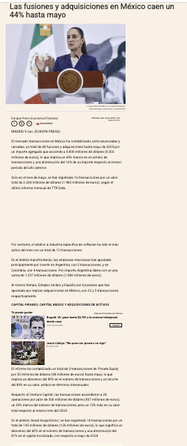 El mercado de transacciones en México se contrajo más, entre adquisición y compra, respecto de fusiones y adquisiciones entre enero y mayo de 2025 con un descenso del 44% en el número de transacciones respecto al mismo periodo del año anterior, hasta un total de 85 operaciones por un importe de 3.025 millones de euros, de acuerdo con el informe mensual sobre el mercado de transacciones en México elaborado por TTR Data.