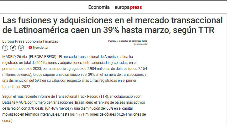 MADRID, 26 (EUROPA PRESS) - El mercado transaccional de América Latina ha registrado un total de 604 fusiones y adquisiciones, entre anunciadas y cerradas, en el primer trimestre de 2023, por un importe agregado de 7.904 millones de dólares (unos 7.154 millones de euros), lo que supone una disminución del 39% en el número de transacciones y una disminución del 69% en su valor, con respecto a las cifras registradas en el primer trimestre de 2022.