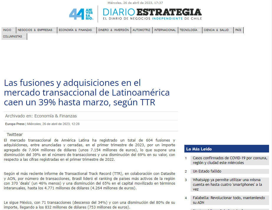 Las fusiones y adquisiciones en el mercado transaccional de Latinoamérica caen un 39% hasta marzo, según TTR