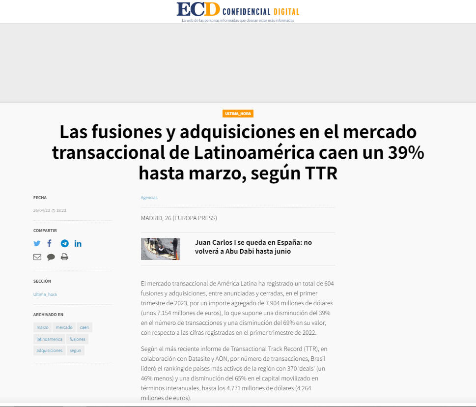 Las fusiones y adquisiciones en el mercado transaccional de Latinoamérica caen un 39% hasta marzo, según TTR