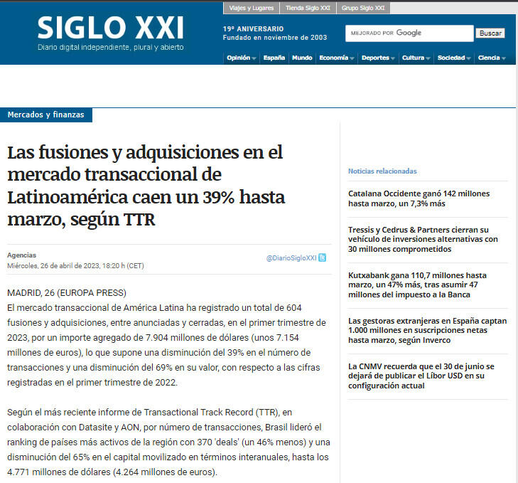 Las fusiones y adquisiciones en el mercado transaccional de Latinoamérica caen un 39% hasta marzo, según TTR