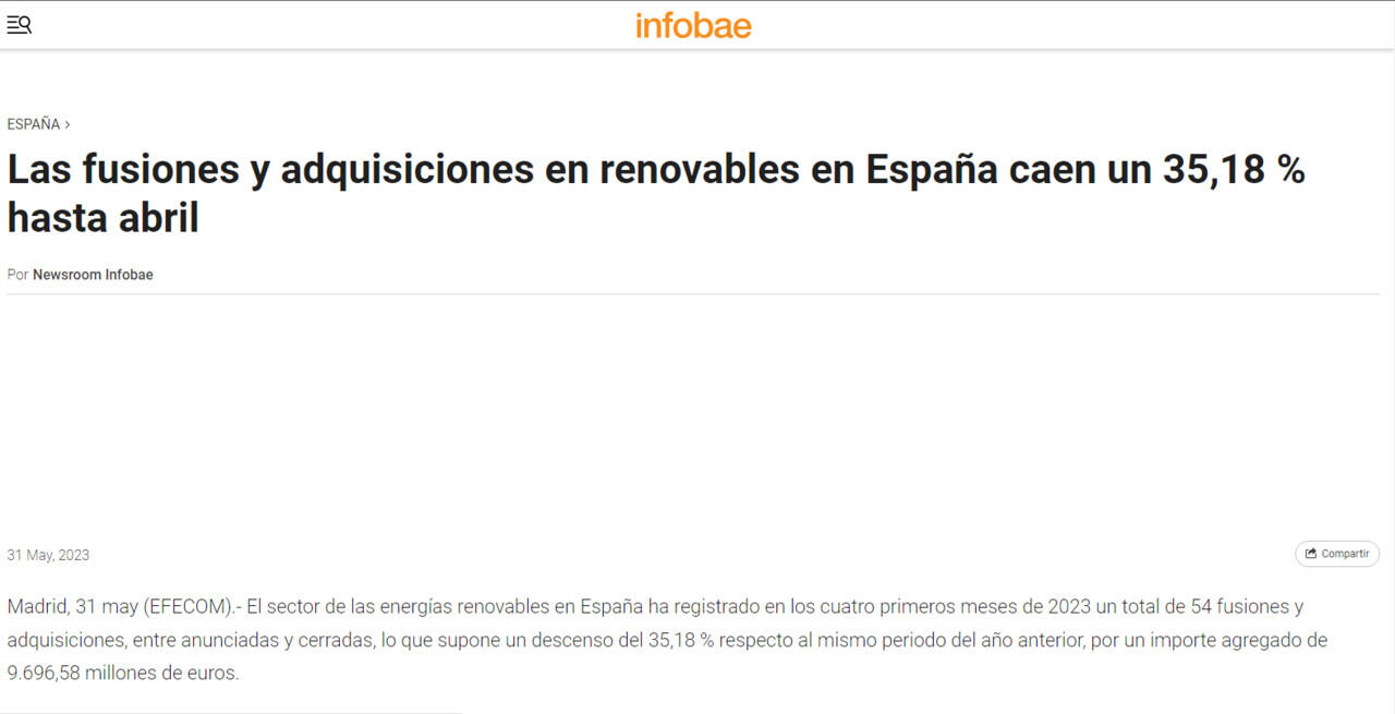 Madrid, 31 may (EFECOM).- El sector de las energías renovables en España ha registrado en los cuatro primeros meses de 2023 un total de 54 fusiones y adquisiciones, entre anunciadas y cerradas, lo que supone un descenso del 35,18 % respecto al mismo periodo del año anterior, por un importe agregado de 9.696,58 millones de euros.